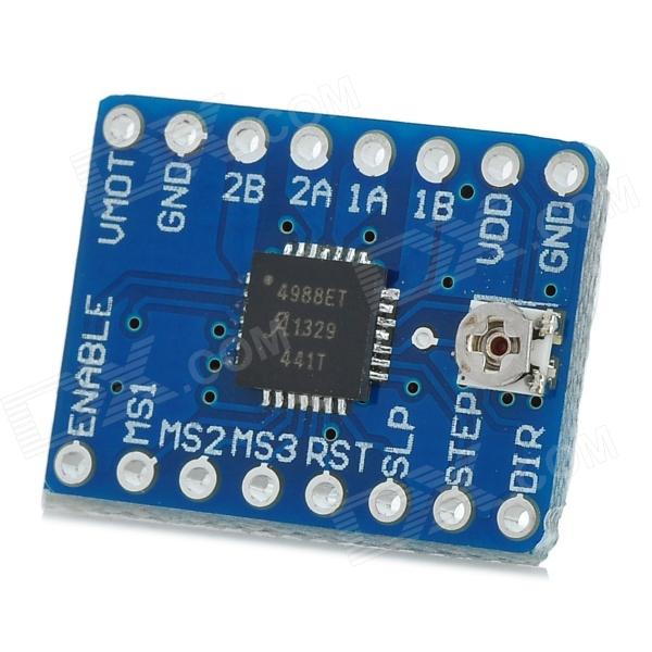 A4988 is a complete microstepping motor driver with built-in translator for easy operation. This product is available in full, half, 1/4, 1/8 and 1/16 step modes operate bipolar stepper motors, output drive capacity up to 35 V and ± 2A. A4988 includes a fixed off-time current regulator, the regulator in slow or mixed decay modes. A4988 converter is the key to the easy implementation. As long as the “step” input inputting one pulse drives the motor one microstep. There are no phase sequence tables, high frequency control lines, or complex interfaces to program. A4988 interface is very suitable for complex microprocessor which is unavailable or is overburdened. In the micro-step operation, A4988 chopping control inside automatically selects the current decay mode (Slow or Mixed). In mixed decay mode, the device is initially set to a fixed downtime in some fast decay, then the rest of the slow decay downtime. Mixed decay current control scheme results in reduced audible motor noise, increased step accuracy, and reduced power consumption. Internal synchronous rectification control circuitry is provided to improve the pulse-width modulation (PWM) operation power consumption. Internal circuit protection includes: thermal shutdown with hysteresis, under voltage lockout (UVLO), and crossover-current protection. Special power sequencing.