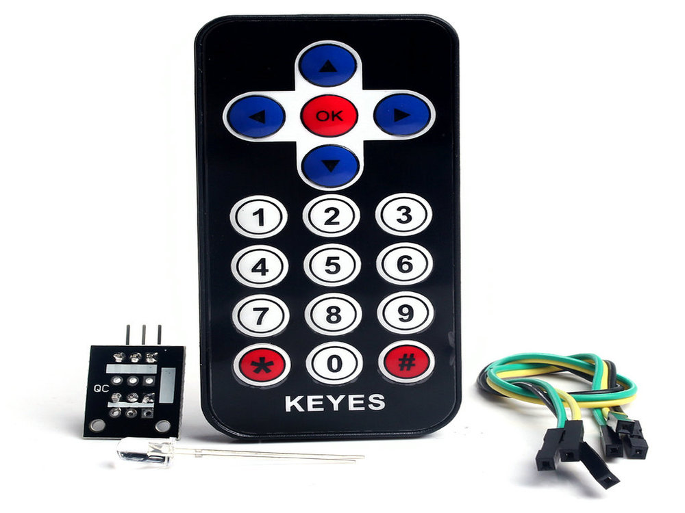 Includes handheld IR Remote, IR receiver module and cable to connect to Arduino. Get extra receivers here